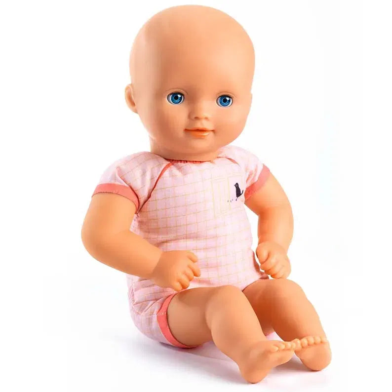 Con i suoi grandi occhi nocciola e il suo viso angelico, è una bambola per bambini dai 18 mesi. È leggera e le sue dimensioni (32 cm) si adattano perfettamente alle piccole braccia. Può essere posizionata come un vero bambino. Il corpo è in tessuto morbido, il viso, le braccia e le gambe sono in vinile molto morbido, piacevole al tatto. Questa bambola è vestita con un vestito e un berretto sulla testa in un bellissimo materiale a doppia garza di cotone 100%.