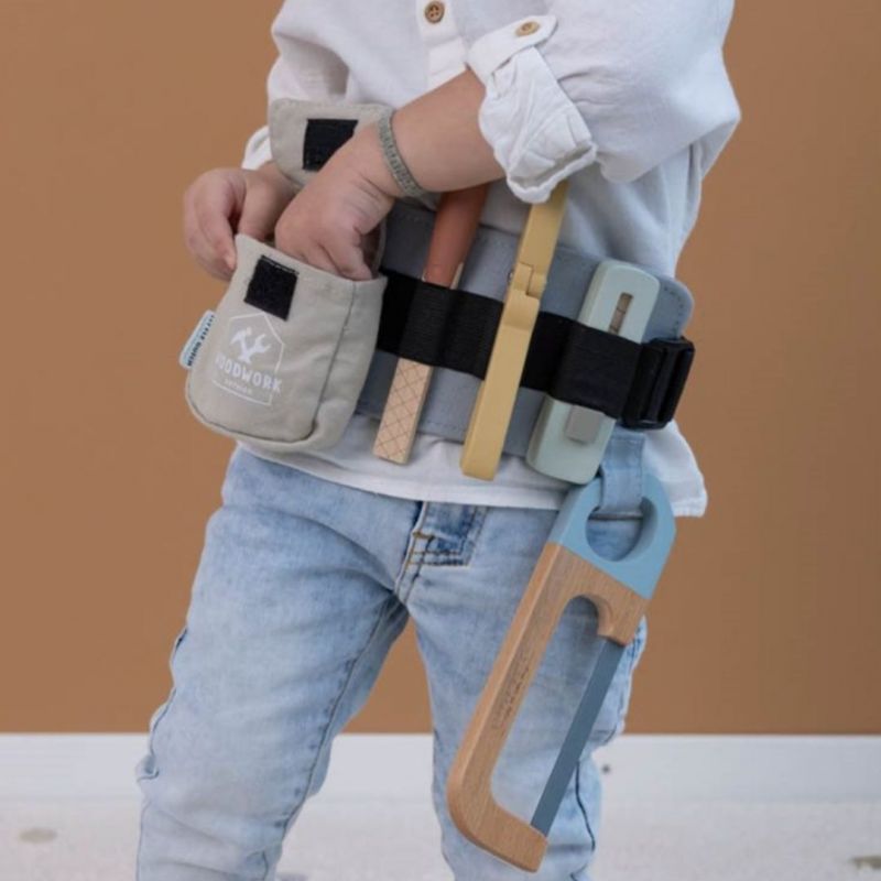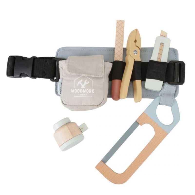 Avvita, martella, sbullona! Una simpatica cintura degli attrezzi in legno, portatile, per i piccoli costruttori di domani! Questo giocattolo ispira immaginazione e creatività.