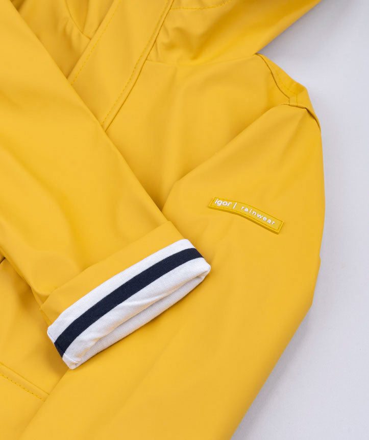 Giacca impermeabile in pvc molto morbida con interno a righe 100% cotone.