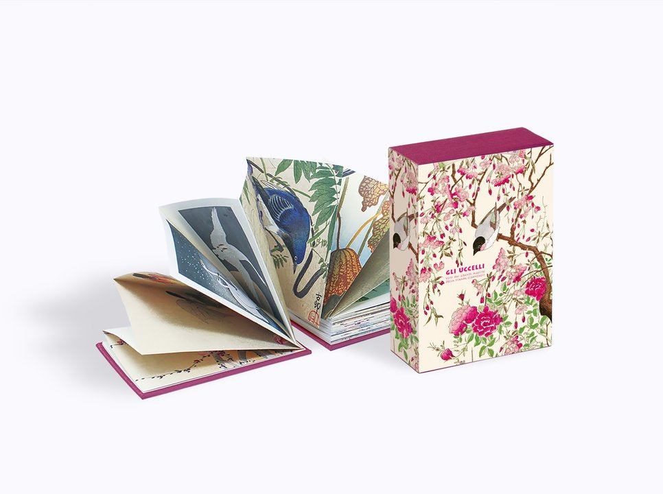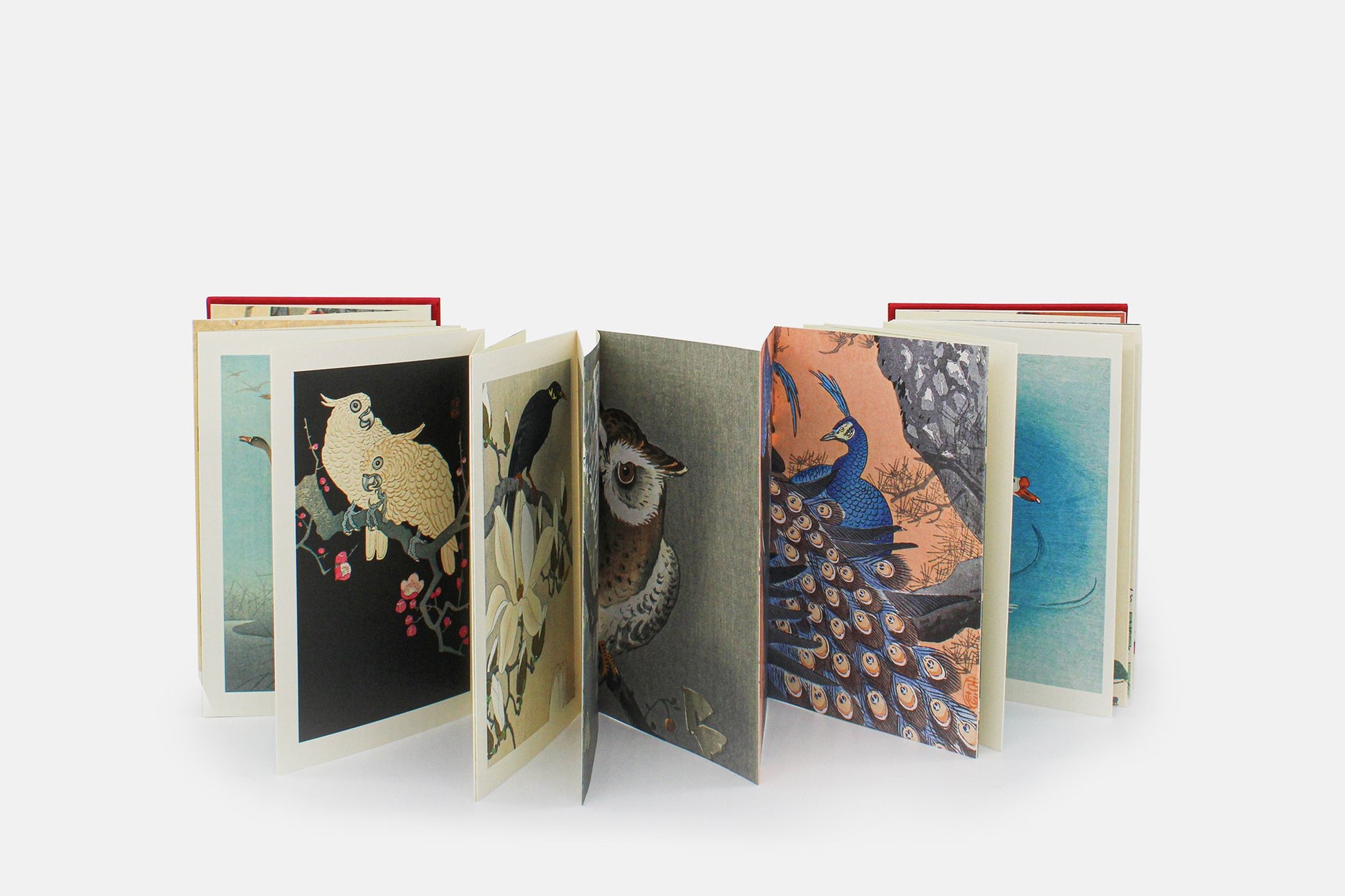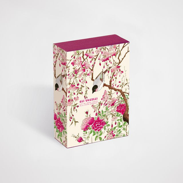 Questo cofanetto celebra il variegato mondo degli uccelli attraverso le opere dei più grandi maestri della stampa giapponese. Contiene un libretto sulla storia dello stile kachō-ga (« immagini di fiori e di uccelli ») e un elegante leporello con oltre 60 riproduzioni volte a celebrare in ogni dettaglio la bellezza della natura. Delicate cince su ciliegi in fiore, maestosi pavoni che fanno la ruota, cacatua dai colori cangianti e civette dormienti sotto la luna piena rivelano tutta la poesia di artisti intramontabili quali Keisai, Keibun, Hiroshige e Koson.