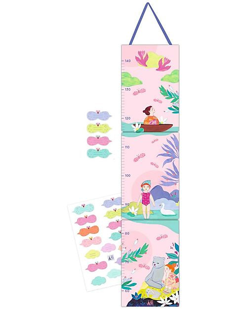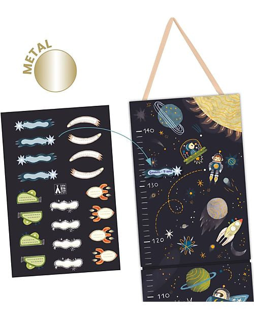 Metro da parete con tantissimi sticker riposizionabili, un bellissimo oggetto decorativo per misurare i bambini man mano che crescono, il metro presenta delle illustraziuoni con riflessi metalizzati e degli sticker per poter scrivere il nome, l'età e la data. Ideale come regalo per la nascita di un bebè o come oggetto decorativo per la cameretta del tuo piccolo