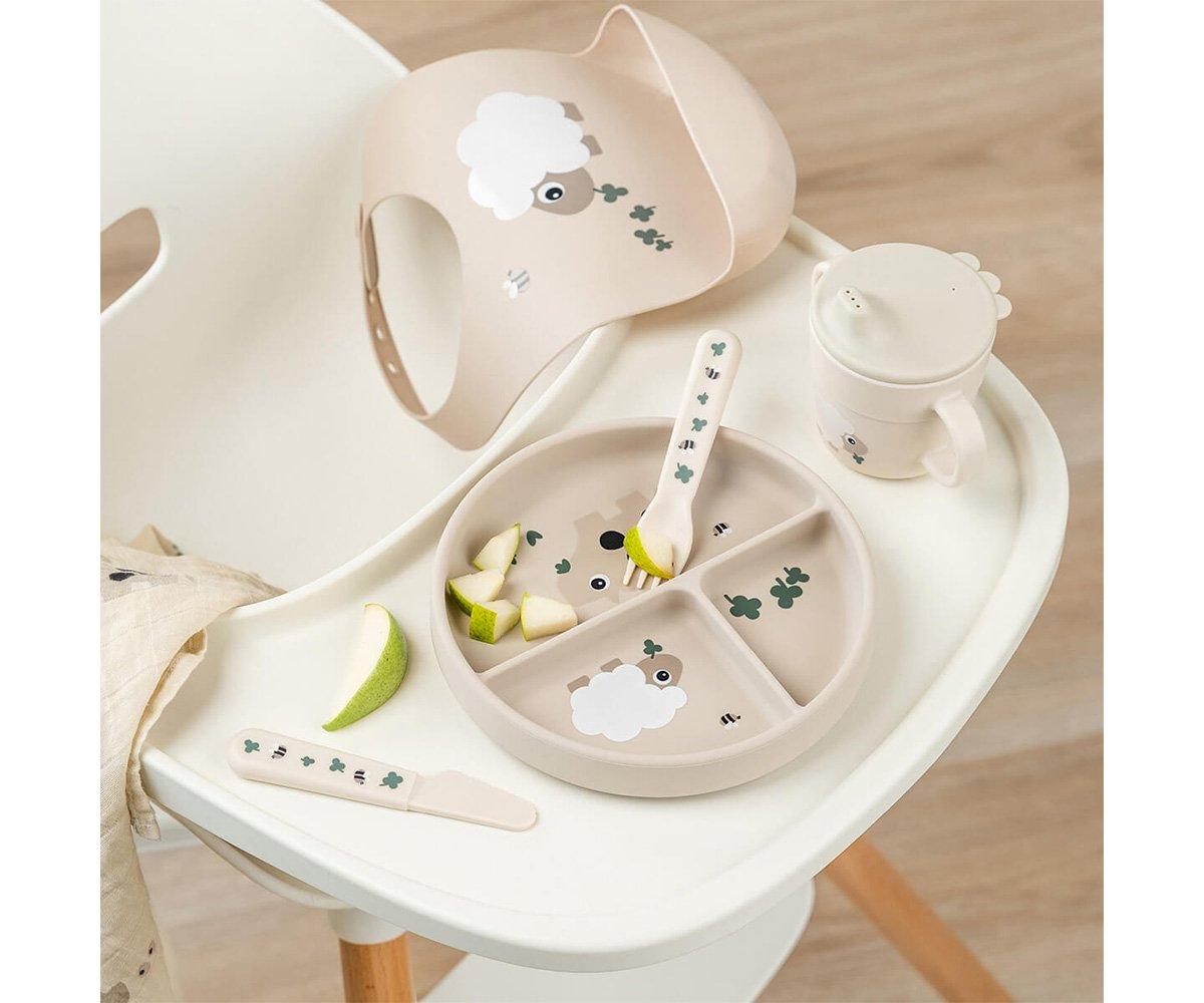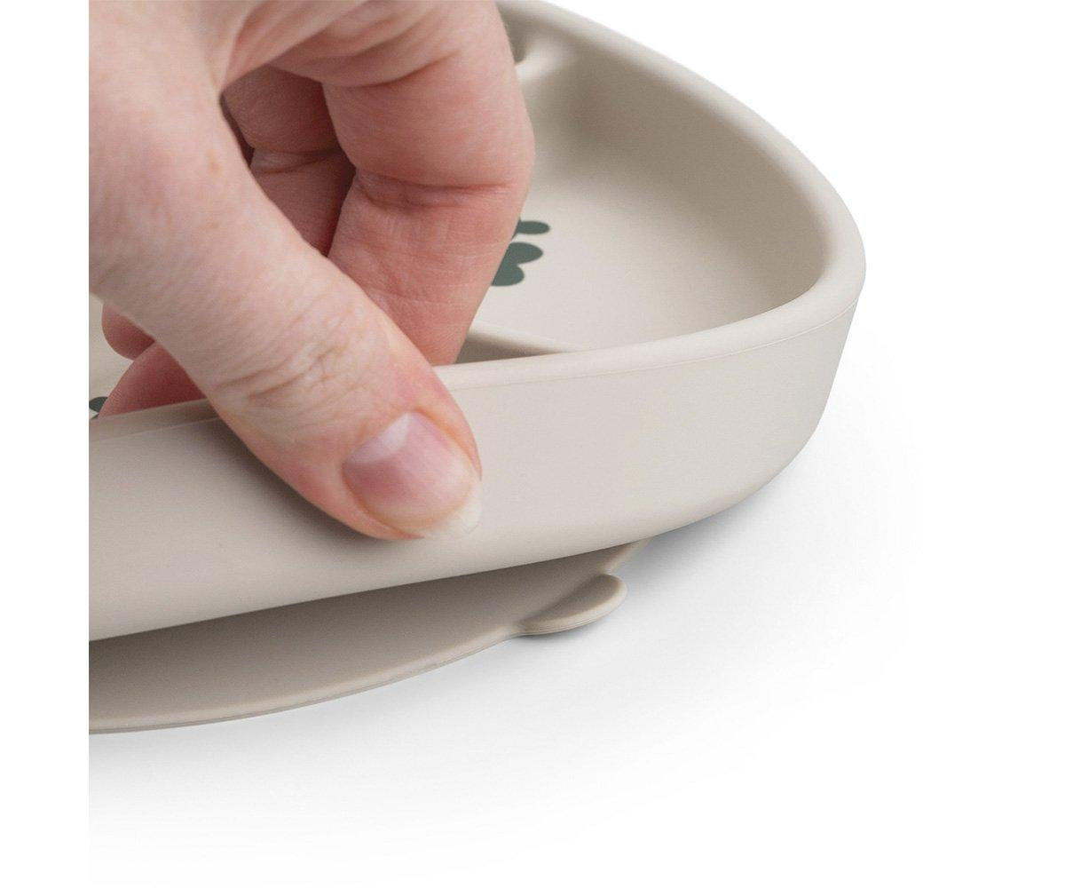 Piatto in silicone alimentare con ventosa integrata che lo farà aderire stabilmente ad ogni superficie, evitando lanci e cadute involontarie.