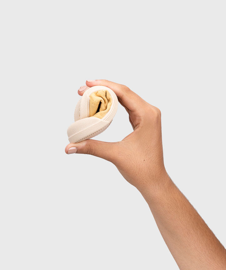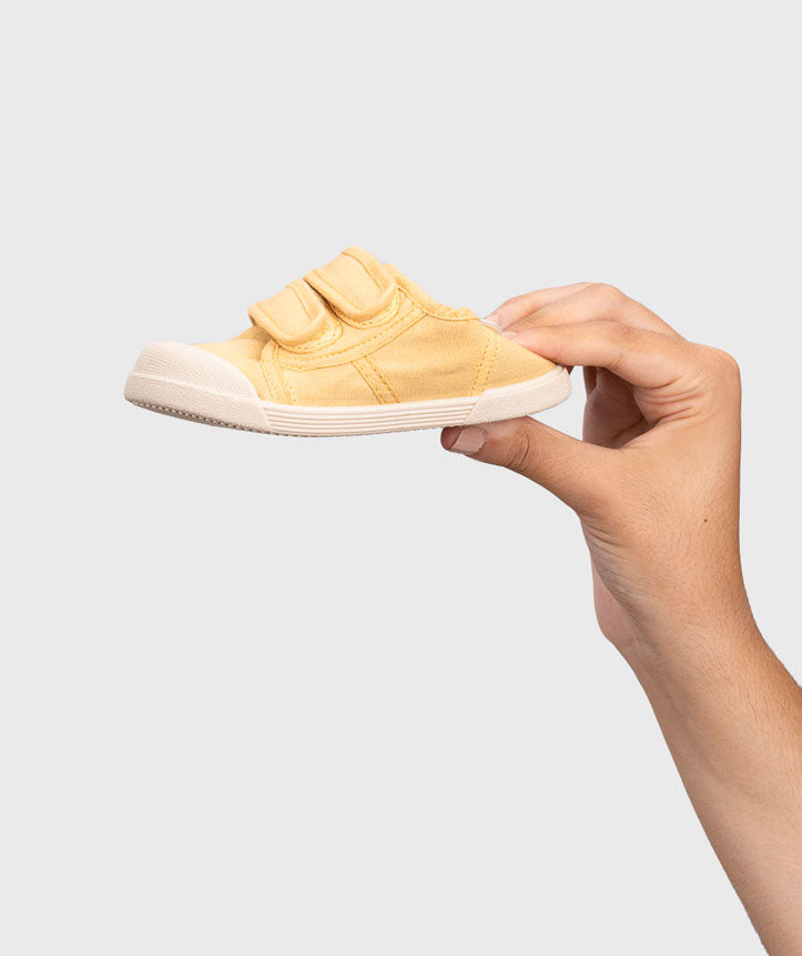 Scarpe in tela con doppio strappo velcro, 100% cotone, concetto barefoot, senza rialzo, flessibile, morbida e con plantare estraibile.
