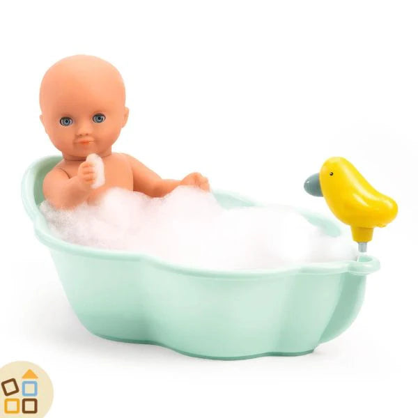 Un accessorio indispensabile per giocare alle bambole. È l’ora del bagno! La vasca ha la forma di una conchiglia con una perfetta doccia a forma di uccellino per trascorrere un piacevole momento con la propria bambola. La doccia funziona come un giocattolo per irrigatori. Una volta che l’acqua è stata pompata, esce attraverso il becco dell’uccello. Al termine del bagno, la vasca viene svuotata e risciacquata con acqua pulita. Da utilizzare con bambole indicate PER BAGNETTO. Per bambole 30-36 cm. Bambola esclusa.