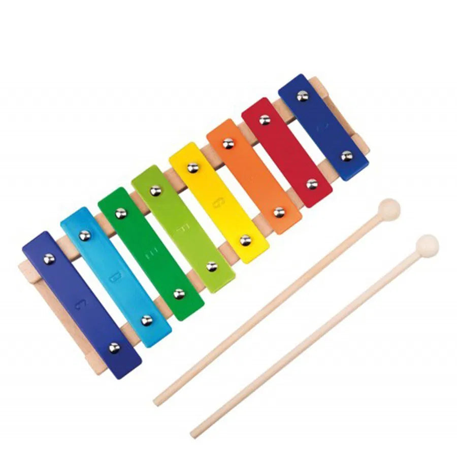 Per i piccoli musicisti, metallofono (xilofono in legno e metallo) multicolore a 8 toni con due bacchette.
